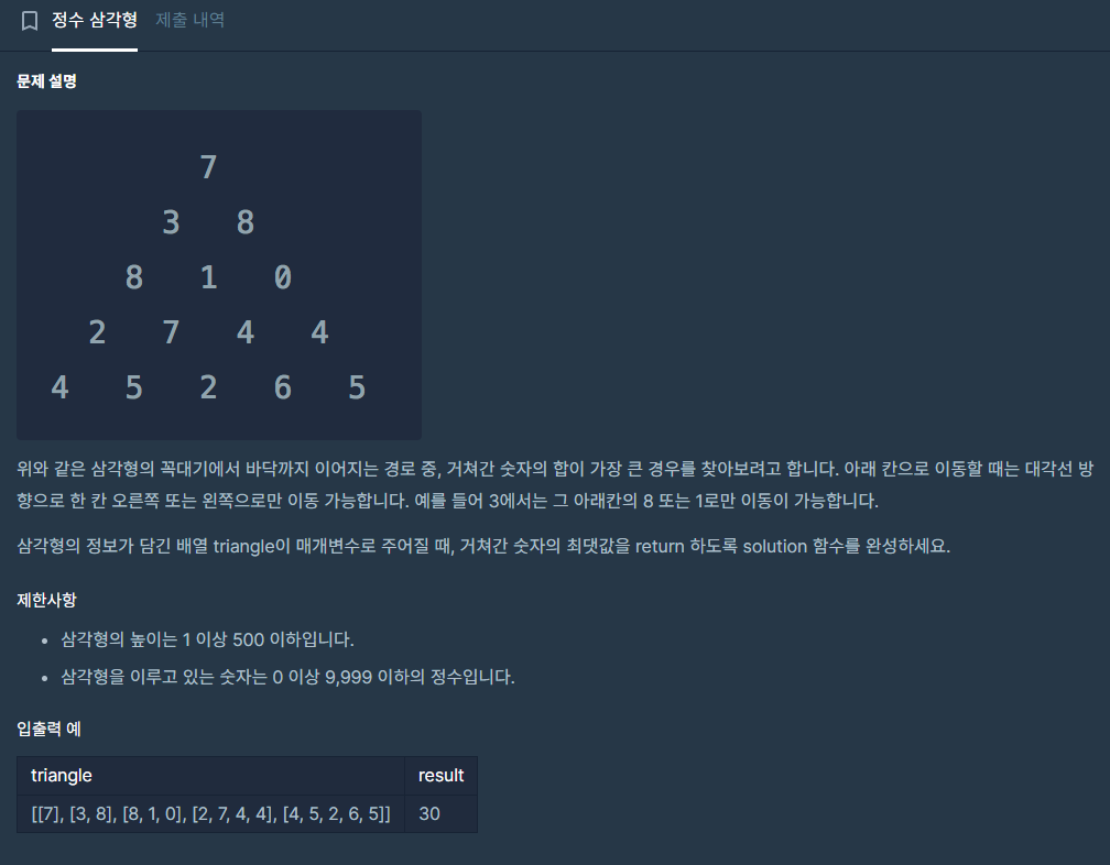 - 최종적으로 삼각형의 꼭대기 위치에 도달하면, 그 위치에 저장된 값이 최댓값이 됩니다.